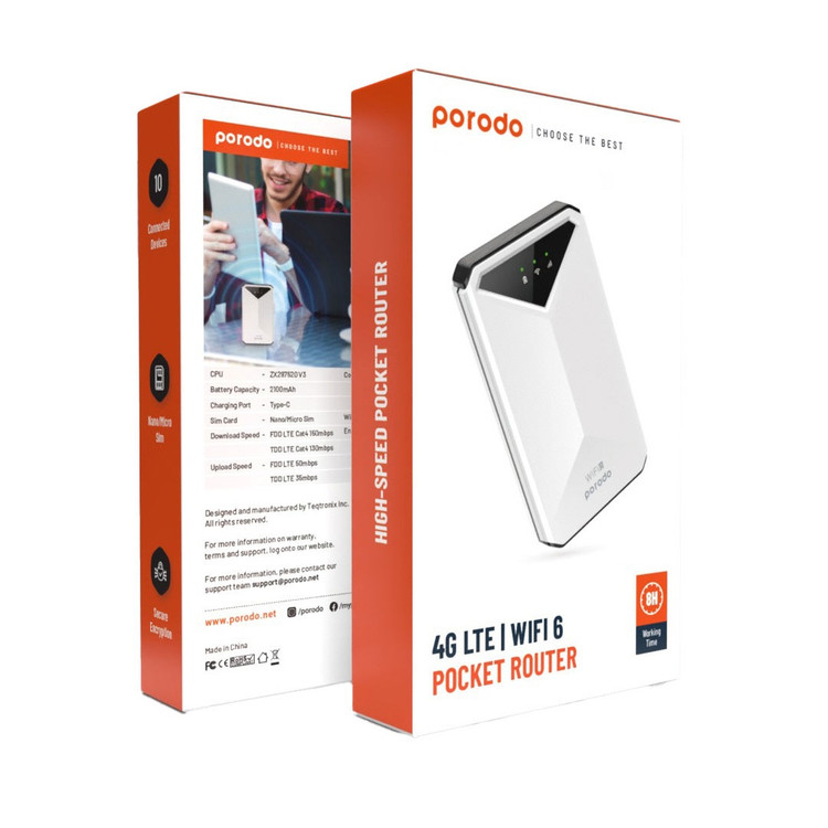 مودم جیبی 4G/LTE پرودو Porodo 4G LTE & WiFi 6 Pocket Router PD-PT4GRWD-WH